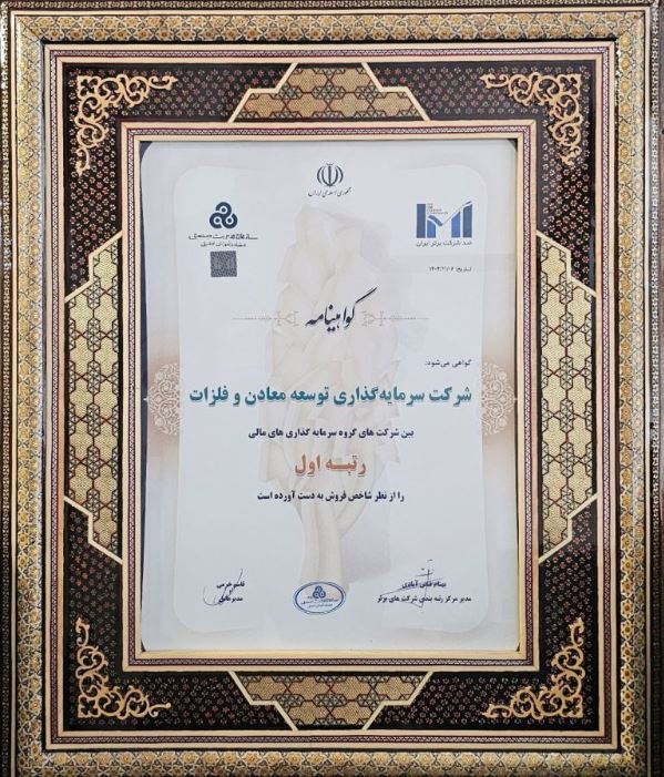 شرکت سرمایهگذاری توسعه معادن و فلزات برای سومین سال پیاپی موفق به کسب رتبه نخست شاخص فروش در گروه سرمایهگذاریهای مالی شد.
