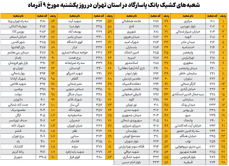 به اطلاع مشتریان ارجمند میرساند، با توجه به تداوم آلودگی هوا و بر اساس تصمیم استانداری تهران و ابلاغیه کانون بانکها و مؤسسات اعتباری خصوصی، ارائه خدمات به مشتریان گرامی در روز یکشنبه، ۹ آذرماه ۱۴۰۴، از طریق شعبههای کشیک و در بازه زمانی ۷:۳۰ الی ۱۳:۳۰ انجام خواهد شد. بدینوسیله فهرست شعبههای کشیک بانک پاسارگاد در استان تهران برای روز یکشنبه ۹ آذرماه به شرح زیر اعلام میگردد.