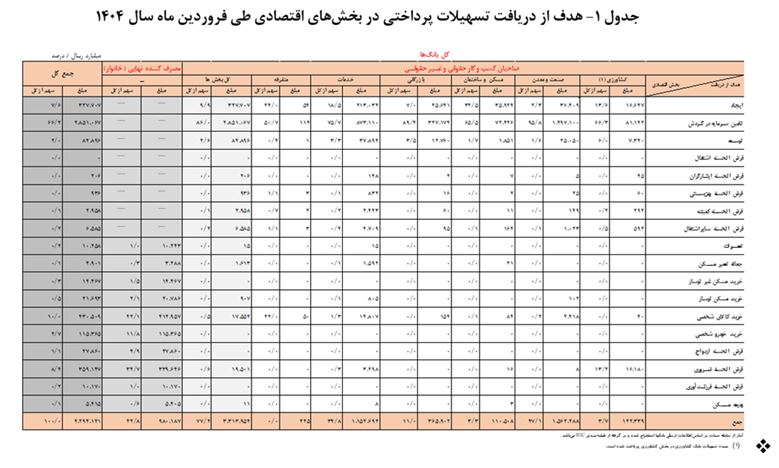 جدول ۱ بیانگر هدف از دریافت تسهیلات پرداختی در بخشهای اقتصادی طی فروردین ماه سال ۱۴۰۴ میباشد. سهم تسهیلات پرداختی در قالب سرمایه در گردش در کلیه بخشهای اقتصادی طی فروردین ماه سال ۱۴۰۴ مبلغ ۲۸۵۱٫۱ هزار میلیارد ریال معادل ۸۶٫۰ درصد کل تسهیلات پرداختی به صاحبان کسب و کار است. همچنین سهم تسهیلات پرداختی در قالب خرید کالای شخصی توسط مصرف کننده نهایی (خانوار) مبلغ ۴۱۳٫۰ هزار میلیارد ریال معادل ۴۲٫۱ درصد از کل تسهیلات پرداختی به مصرف کنندگان نهایی (خانوار) میباشد.